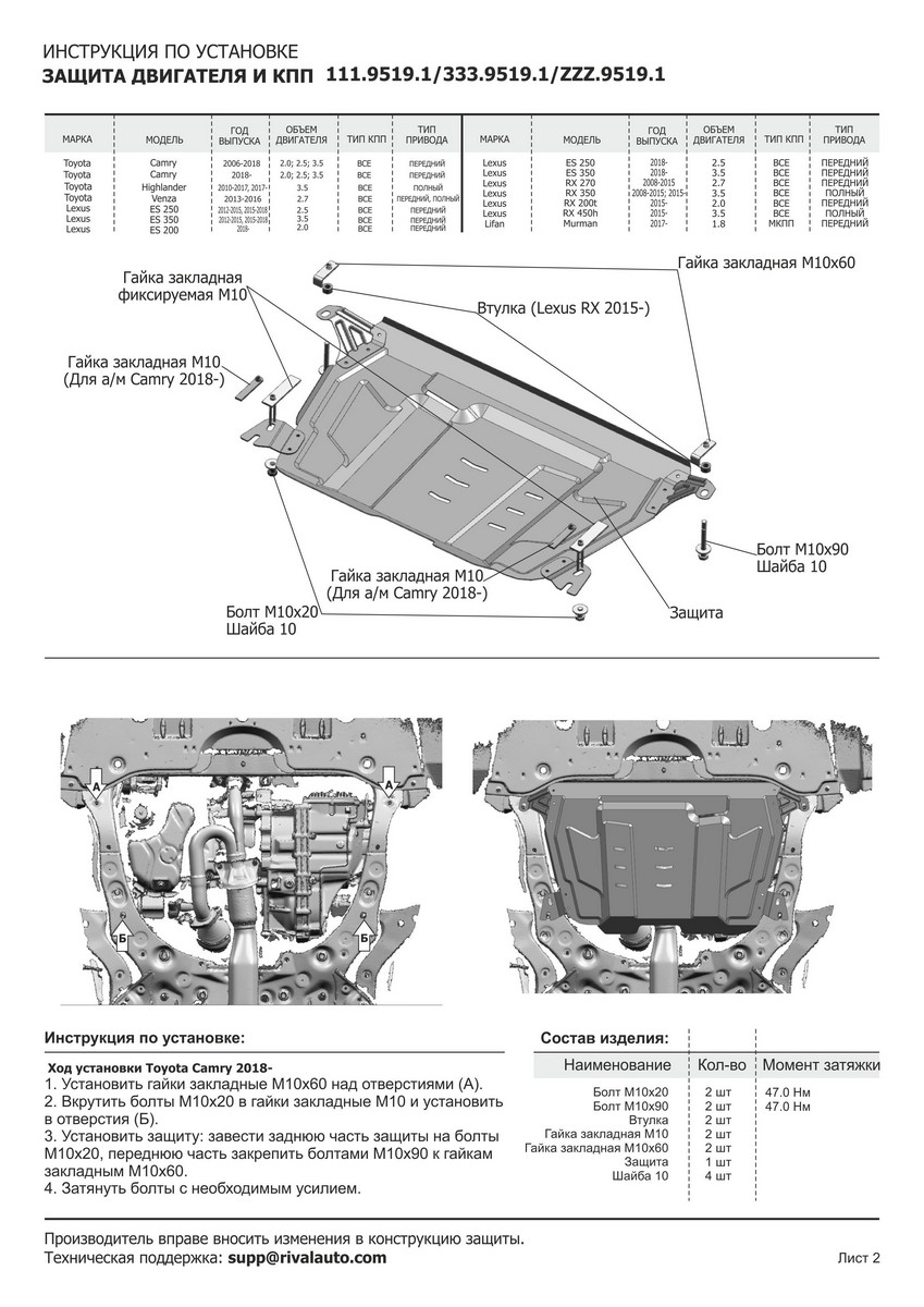 Защита картера и КПП Rival для Lexus ES (V - 2.5; 3.5) 2012-2015/Lexus ES (V - 2.5; 3.5) 2015-2018/Lexus ES XV70 (V - 2.0; 2.5; 3.5) 2018-н.в./Lexus RX 270/350 (V - все) 2008-2015/Lexus RX 350/200t/450h (V - все) 2015-н.в./Lifan Murman (V - 1.8) МКПП 2017-н.в./Toyota Camry (V - 2.4; 3.5) 2006-2011/Toyota Camry (V - 2.0; 2.5; 3.5) 2011-2014/Toyota Camry (V - 2.0; 2.5; 3.5) 2014-2018/Toyota Camry XV70 (V - 2.0; 2.5; 3.5) 2018-н.в./Toyota Highlander (V - 3.5) 2010-2014/Toyota Highlander (V - 3.5) 2014-2017/Toyota Highlander (V - 3.5) 2017-н.в./Toyota Venza (V - 2.7) 2013-2016, алюминий 4 мм, с крепежом, 333.9519.1