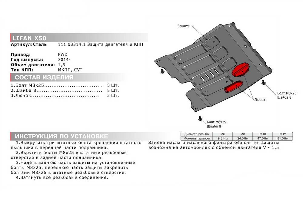 Обращаем ваше внимание, на тот факт, что защита имеет форму, соответствующую модели данного автомобиля. Наличие глубокого штампа и лючков для смены фильтров/масла предусмотрено не на всех защитах. Фото служит для визуального восприятия товара.