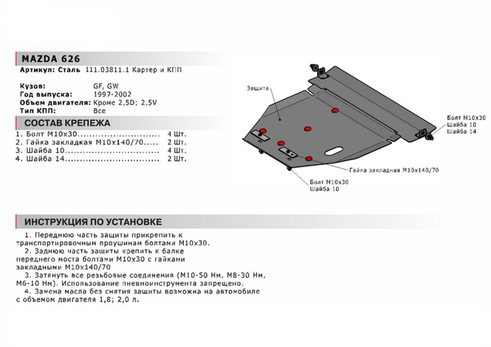 В нашем интернет-магазине можно купить Защиту картера и КПП Автоброня для Mazda 626 (кроме 2,5D; 2,5V6) 1997-2002