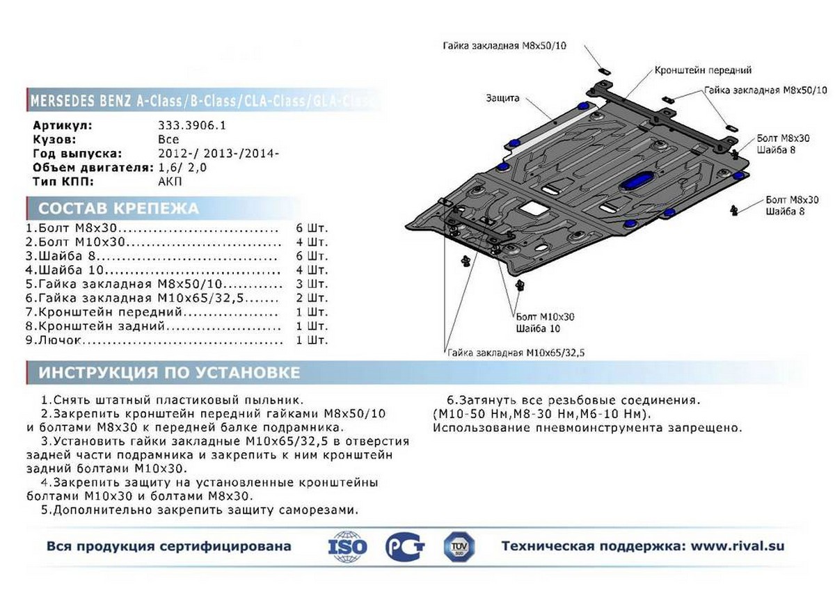 Защита картера и КПП Rival для Infiniti Q30 (V - 1.6t; 2.0t) 2016-н.в./Infiniti QX30 (V - 2.0t) 2016-н.в./Mercedes-Benz A-class (V - 1.6) 2012-2018/Mercedes-Benz B-class (V - 1.6) 2012-н.в./Mercedes-Benz CLA-class (V - 1.6) 2013-н.в./Mercedes-Benz GLA-class (V - 1.6; 2.0) 2013-н.в., алюминий 4 мм, с крепежом, 333.3906.1