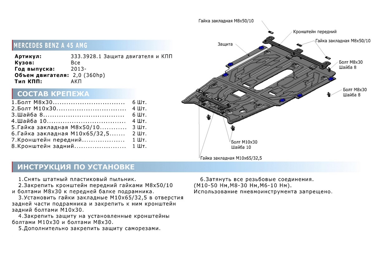 Защита картера и КПП Rival для Mercedes-Benz A-class (V - 2.0 (360 л.с.)) (45 AMG) 2013-н.в./Mercedes-Benz CLA-class (V - 2.0 (360 л.с.)) (45 AMG) 2013-н.в./Mercedes-Benz GLA-class (V - 2.0 (360 л.с.)) (45 AMG) 2014-н.в., алюминий 4 мм, с крепежом, 333.3928.1