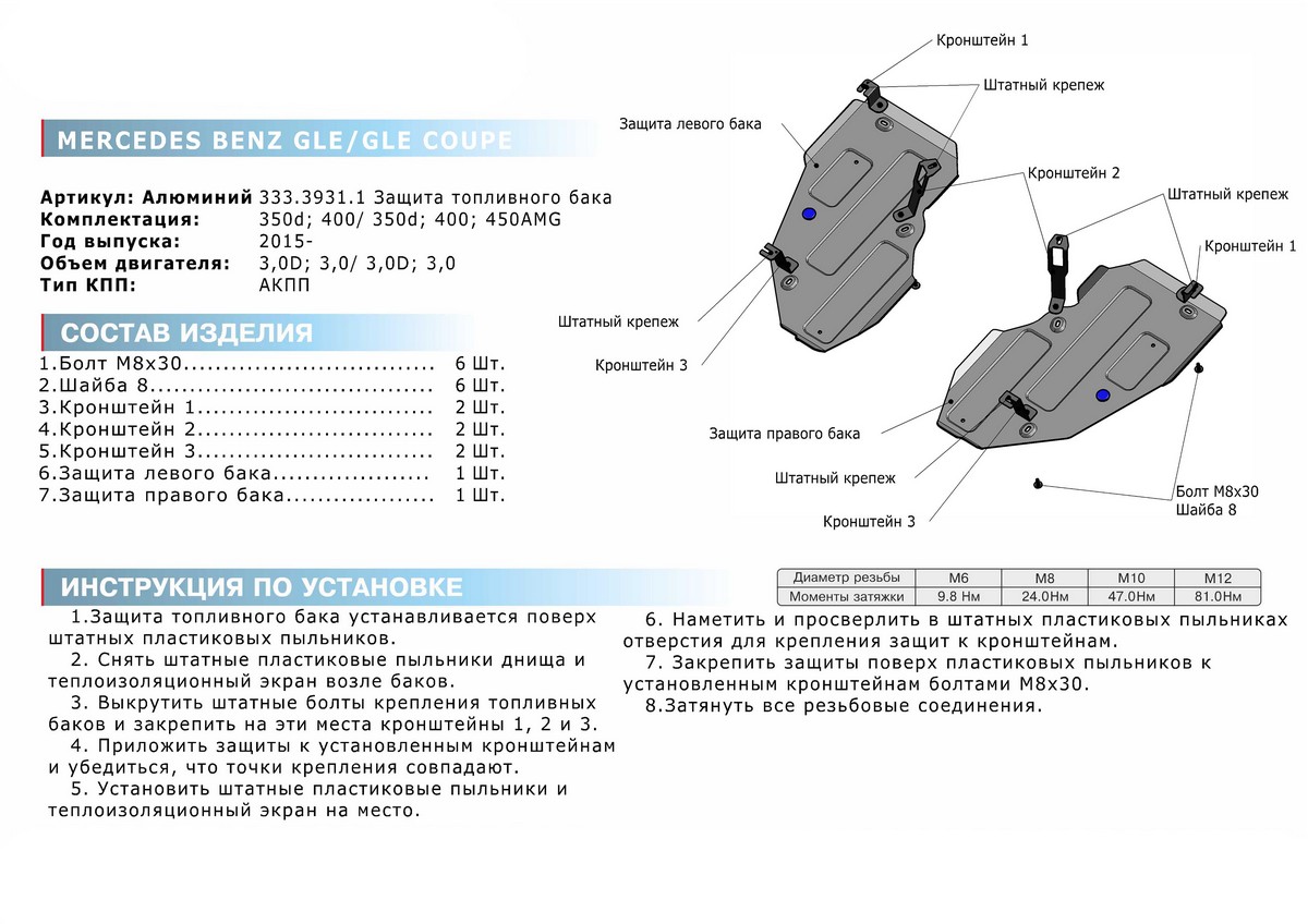Защита топливного бака Rival для Mercedes-Benz GLE внедорожник 5-дв. (V - 250d; 350d; 400) 2015-н.в./Mercedes-Benz GLE купе (V - 350d; 400; 450 AMG) 2015-н.в., алюминий 4 мм, с крепежом, 333.3931.1