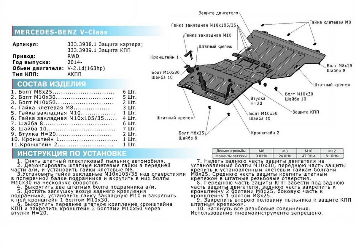 Защита картера Rival для Mercedes-Benz V-class (V - 2.1d (163 л.с.)) АКПП RWD 2014-н.в., алюминий 4 мм, с крепежом, 333.3938.1