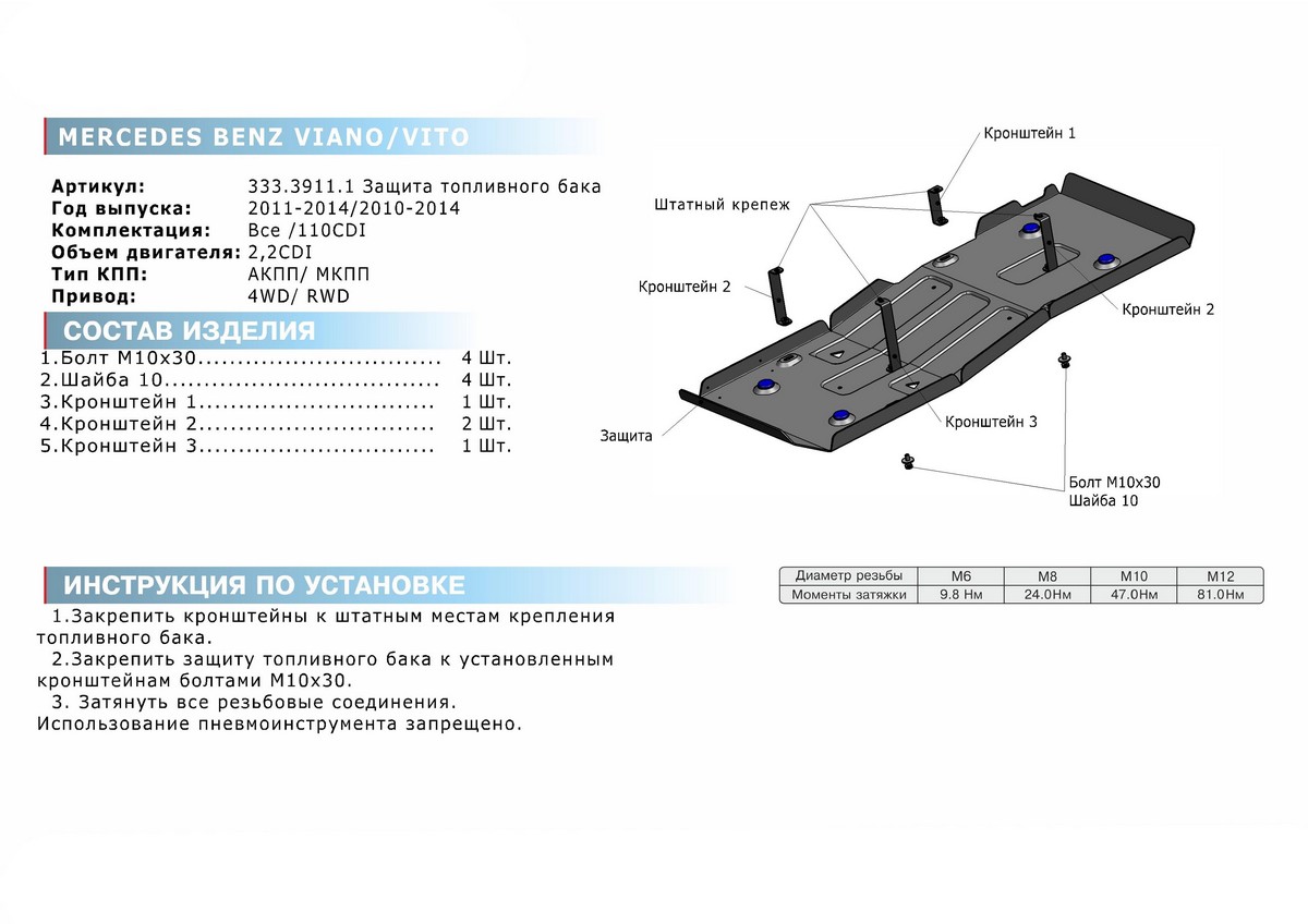 Защита топливного бака Rival для Mercedes-Benz Viano (V - 2.2d) 4WD 2011-2014, алюминий 4 мм, с крепежом, 333.3911.1