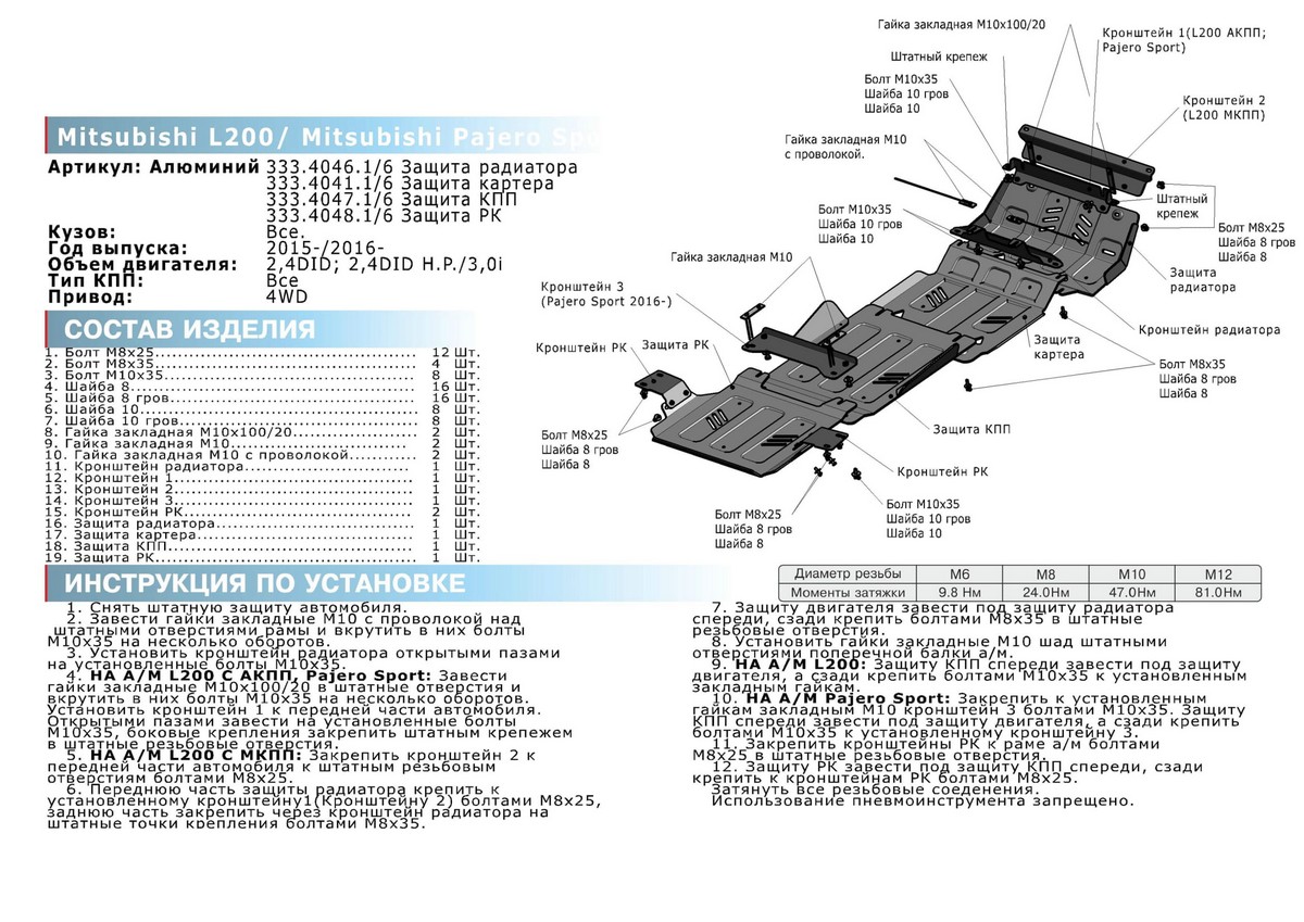 Защита радиатора, картера, КПП и РК Rival для Fiat Fullback (V - 2.4d) 2016-н.в./Mitsubishi L200 V (V - 2.4d; 2.4d H.P.) 2015-2018 2018-н.в./Mitsubishi Pajero Sport III (V - 3.0; 2.4d) 2016-н.в., алюминий 6 мм, с крепежом, K333.4046.3.6