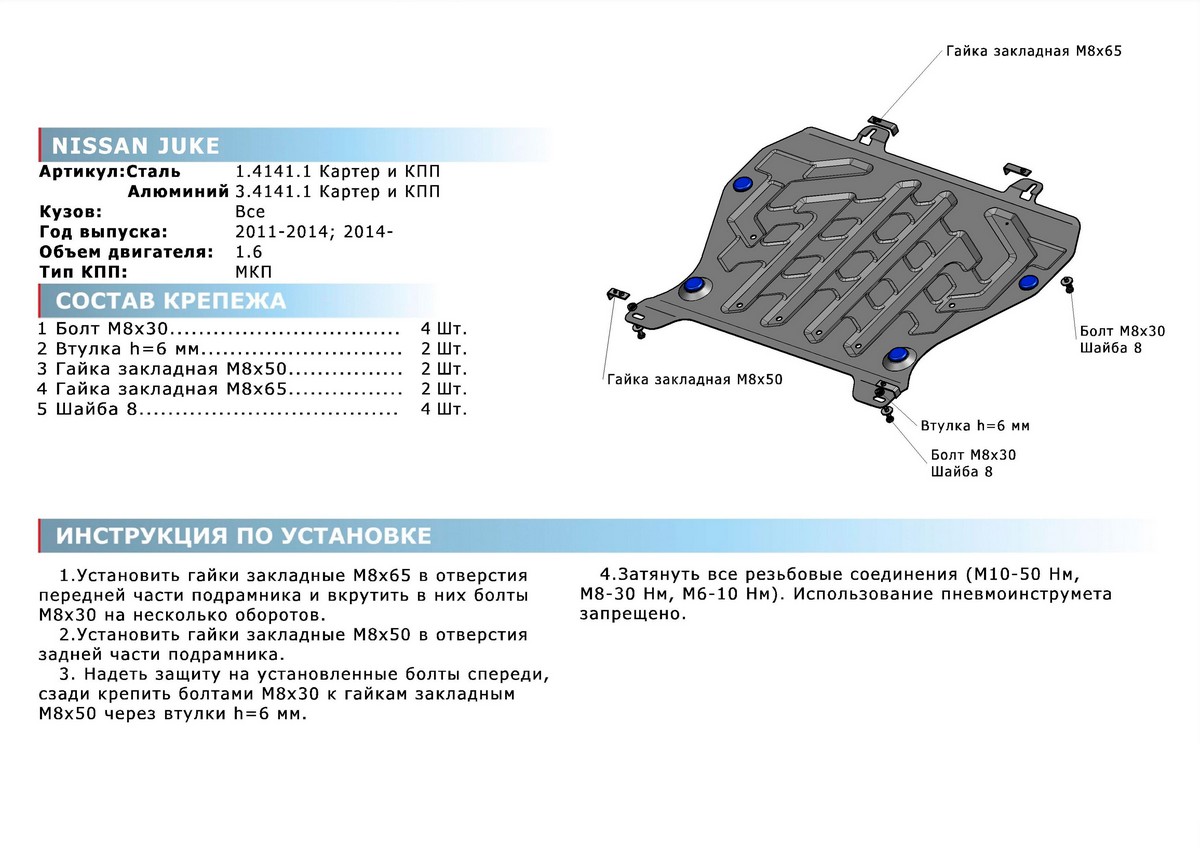 Защита картера и КПП Rival для Nissan Juke (V - 1.6) 2011-2017/Nissan Juke (V - 1.6) 2017-н.в., алюминий 4 мм, с крепежом, 333.4141.1