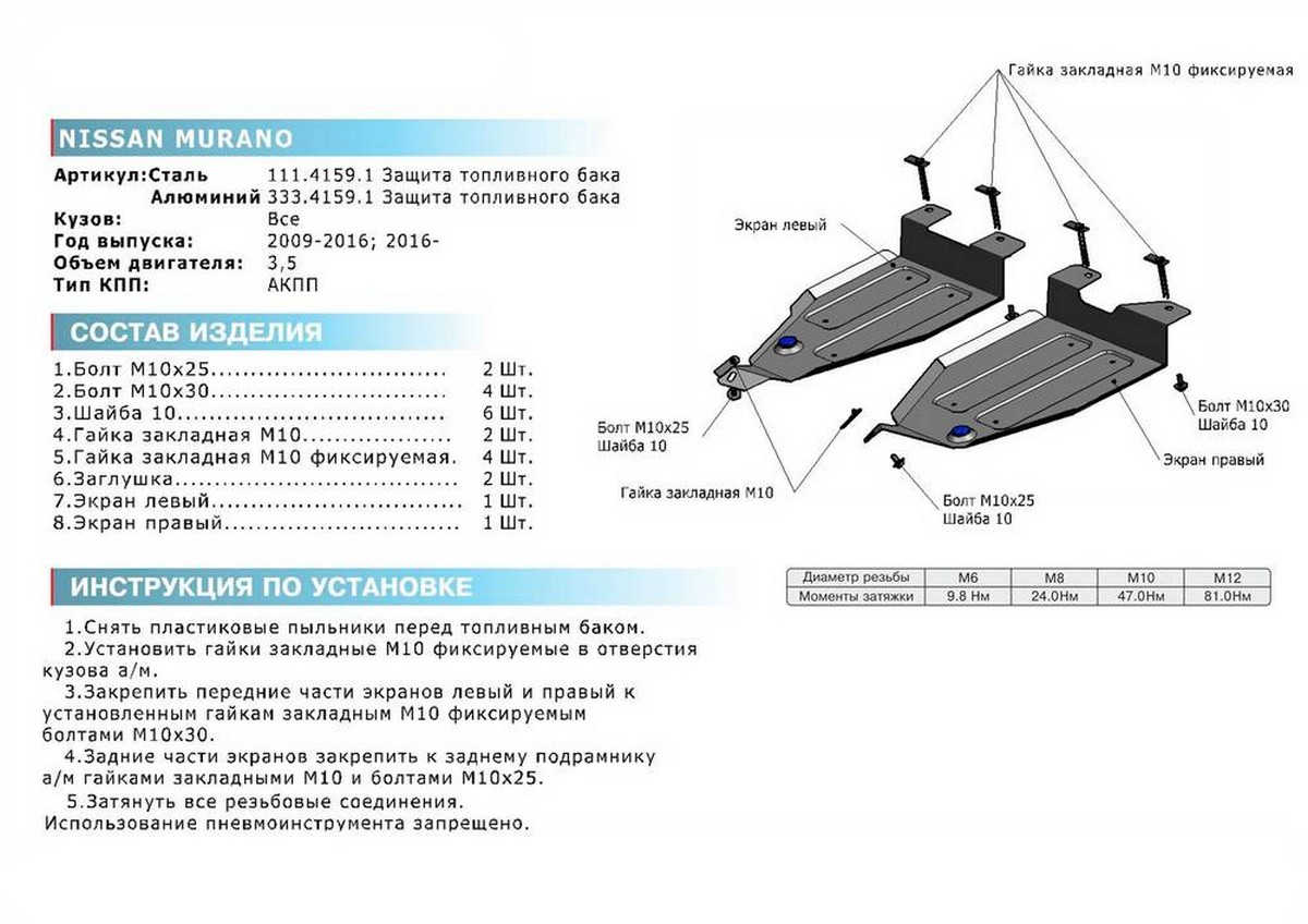 Защита топливного бака Rival для Nissan Murano (V - 3.5) 2009-2016/Nissan Murano (V - 3.5) 2016-н.в., алюминий 4 мм, с крепежом, 333.4159.1