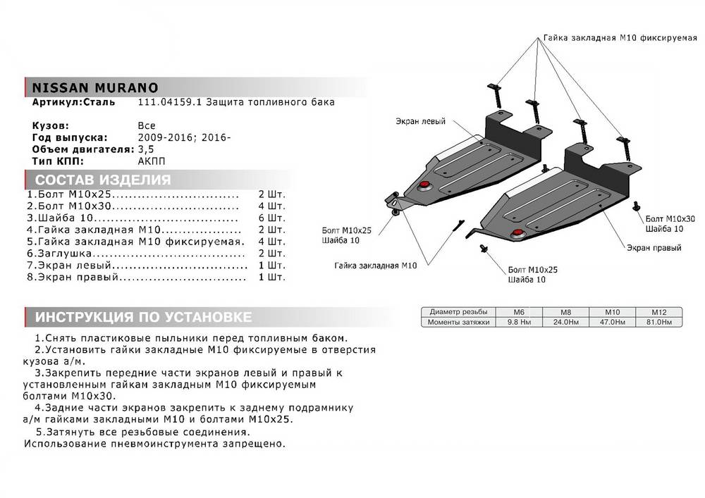 В нашем интернет-магазине можно купить Защиту топливного бака Автоброня для Nissan Murano 2009-2016, 2016-