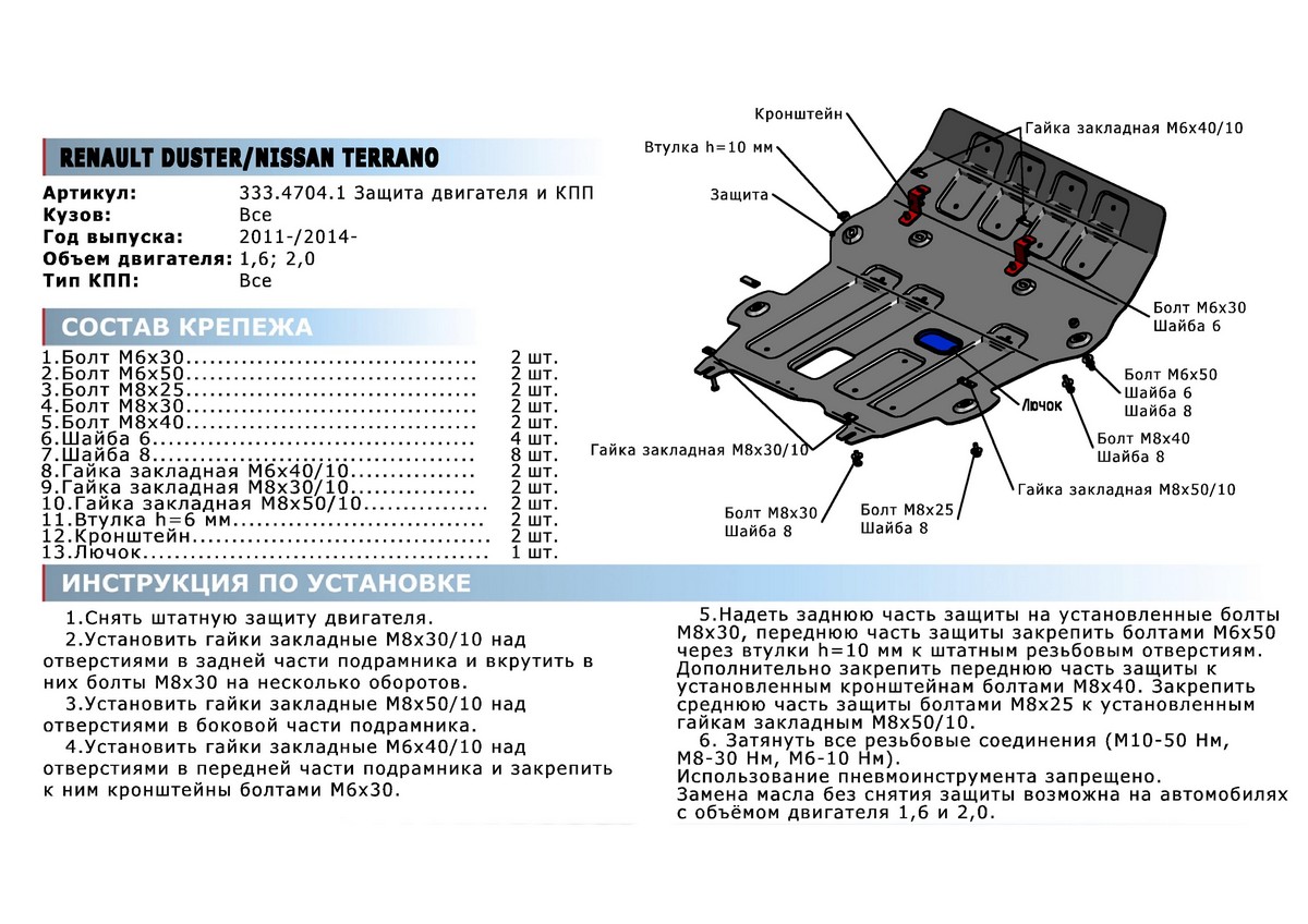 Обращаем ваше внимание, на тот факт, что защита имеет форму, соответствующую модели данного автомобиля. Наличие глубокого штампа и лючков для смены фильтров/масла предусмотрено не на всех защитах. Фото служит для визуального восприятия товара.