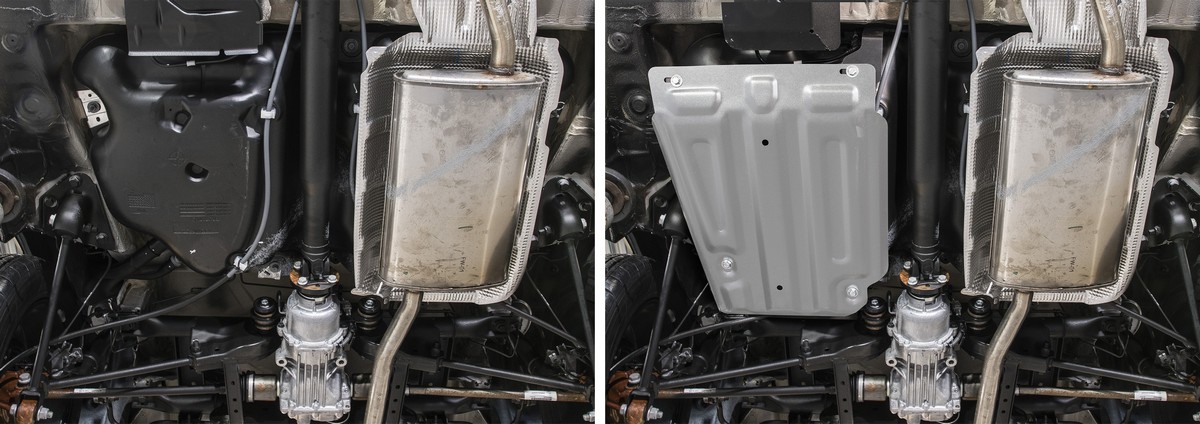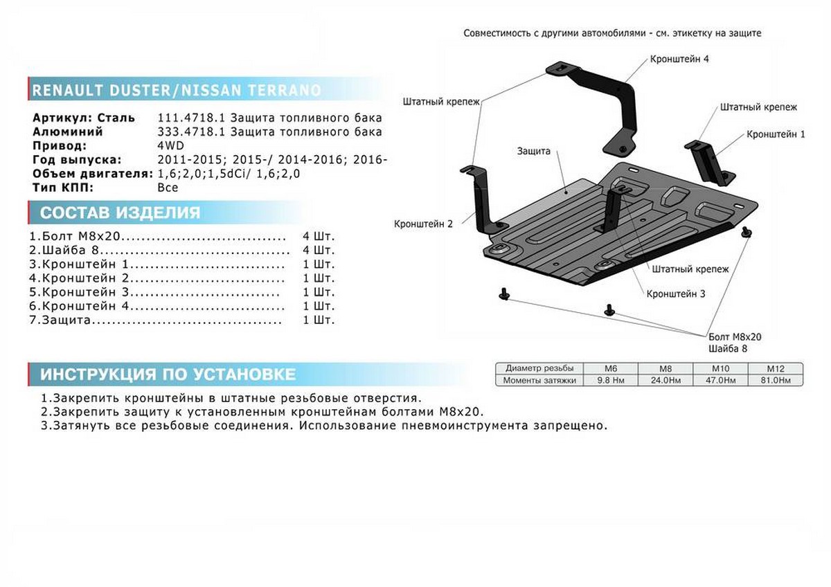 Защита топливного бака Rival для Nissan Terrano (V - 1.6; 2.0) 4WD 2014-2016/Nissan Terrano (V - 1.6; 2.0) 4WD 2016-н.в./Renault Duster (V - 1.6; 2.0; 1.5d) 4WD 2011-2015/Renault Duster (V - 1.6; 2.0; 1.5d) 4WD 2015-н.в./Renault Kaptur (V - 2.0) 4WD 2016-н.в., алюминий 4 мм, с крепежом, 333.4718.1