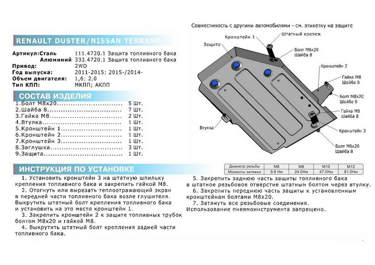 Защита топливного бака Rival для Nissan Terrano (V - 1.6; 2.0) FWD 2014-2016/Nissan Terrano (V - 1.6; 2.0) FWD 2016-н.в./Renault Duster (V - 1.6; 2.0) FWD 2011-2015/Renault Duster (V - 1.6; 2.0) FWD 2015-н.в./Renault Kaptur (V - 1.6) FWD 2016-н.в., алюминий 4 мм, с крепежом, 333.4720.1