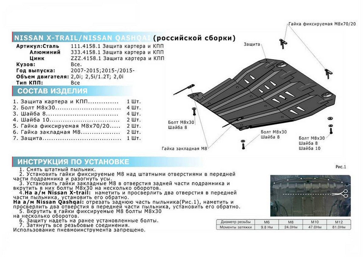 Защита картера и КПП Rival для Nissan Qashqai (V - 1.2T; 2.0) сборка РФ 2015-2019/Qashqai (V - 2.0) 4WD 2019-/X-Trail (V - 2.0; 2.5) 2007-2015 2015-2018/X-Trail (V - 2.5) 4WD 2018-/Renault Koleos (V - 2.0; 2.5; 2.0d) 2008-2017 2017-, алюминий 4 мм, с крепежом, 333.4158.1
