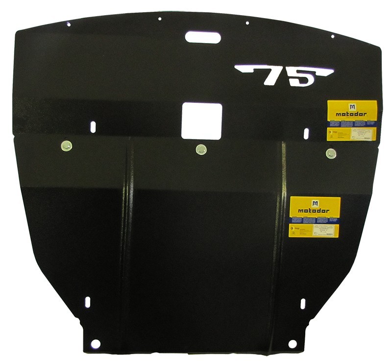 Защита двигателя Motodor для машины Rover 75 (1999-2005) произведена из качественной горячекатаной стали марки СТ3 толщиной два миллиметра. Защита картера имеет ребра жесткости и вентиляционные отверстия, позволяющие соблюдать температурный режим. В некоторых вариантах защиты предусмотрены отверстия для слива масла и замены фильтров, но при тех.обслуживании рекомендуется снимать защиту картера полностью для осмотра двигателя.