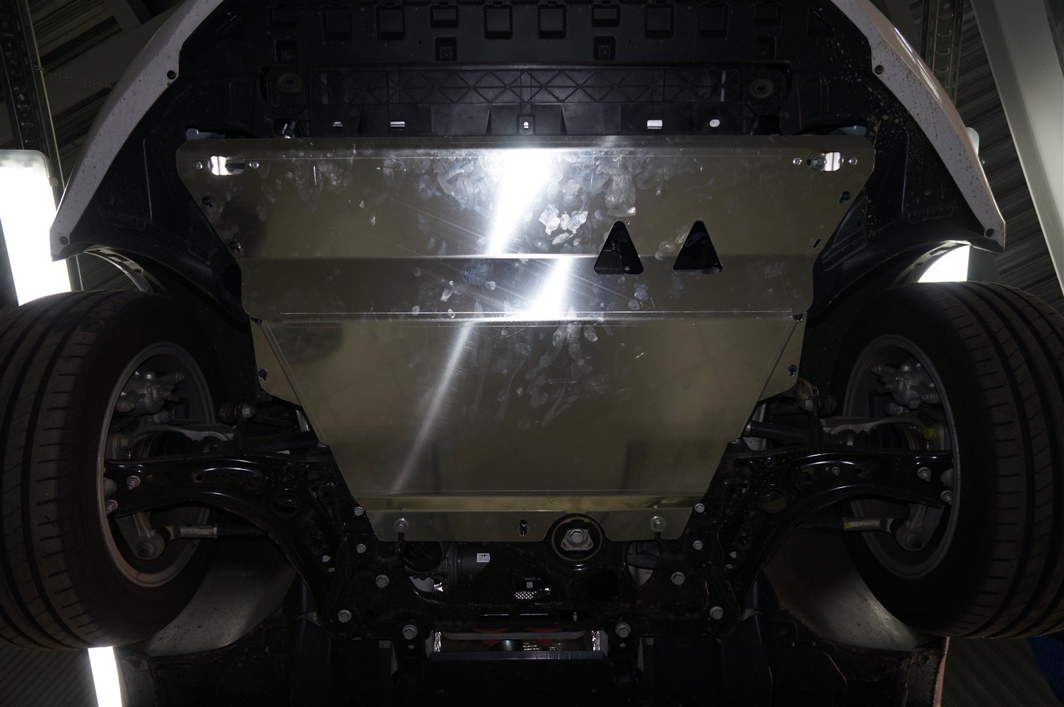 Алюминиевые защиты АВС-дизайн на Seat Leon III (2013-) отличаются высокой жесткостью. При том, что толщина листа алюминия составляет около 5 мм, защита имеет меньший вес, чем стальная такой же толщины.