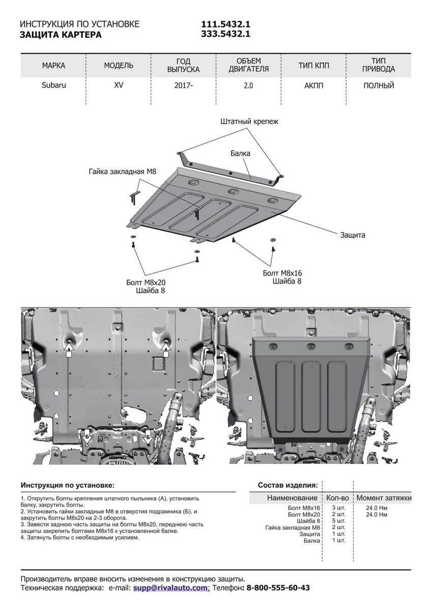 Защита картера Rival для Subaru XV II (V - 2.0) 4WD 2017-н.в., алюминий 4 мм, с крепежом, 333.5432.1