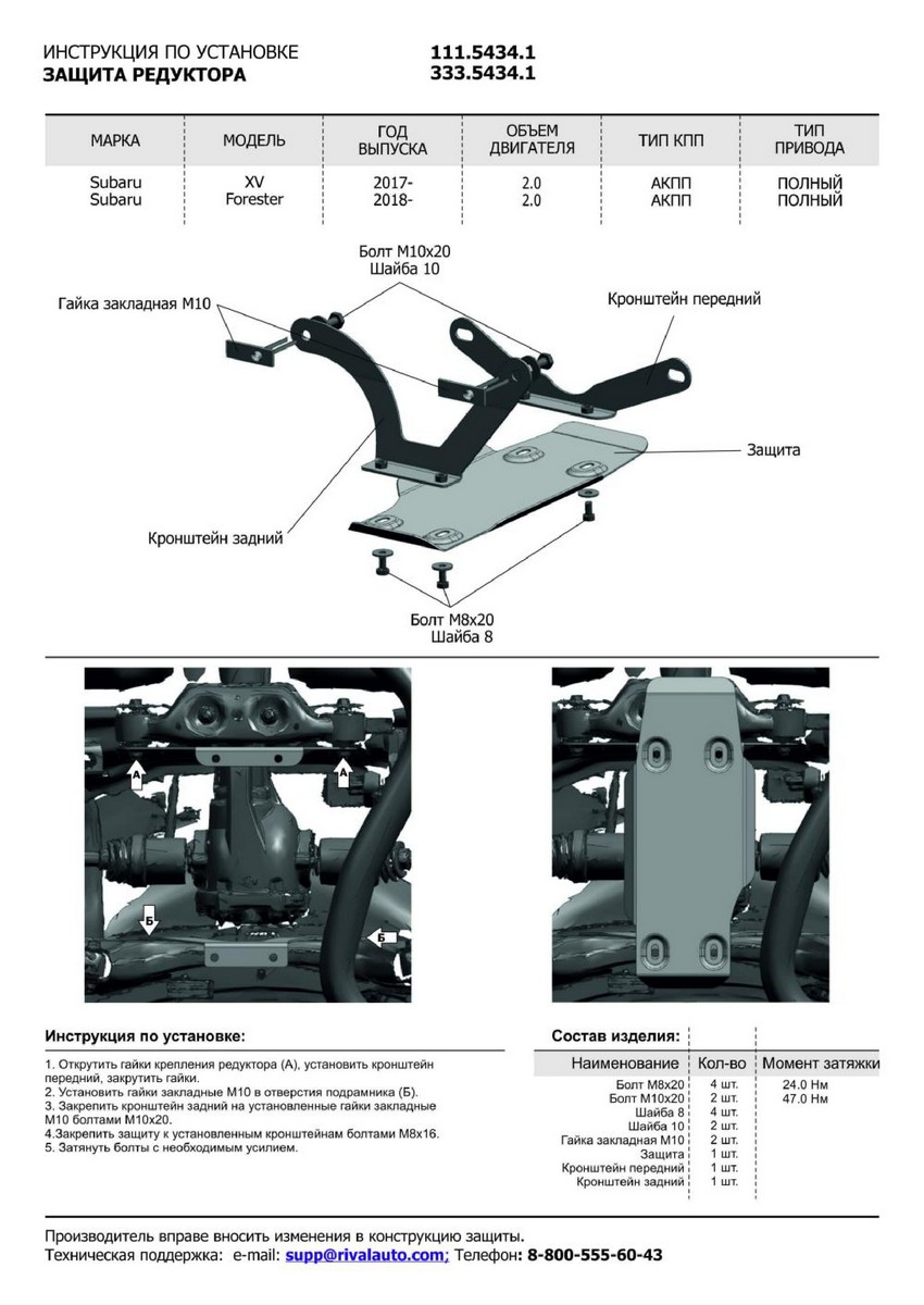 Защита редуктора Rival для Subaru Forester V (V - 2.0) 4WD 2018-н.в./Subaru XV II (V - 2.0) 4WD 2017-н.в., алюминий 4 мм, с крепежом, 333.5434.1