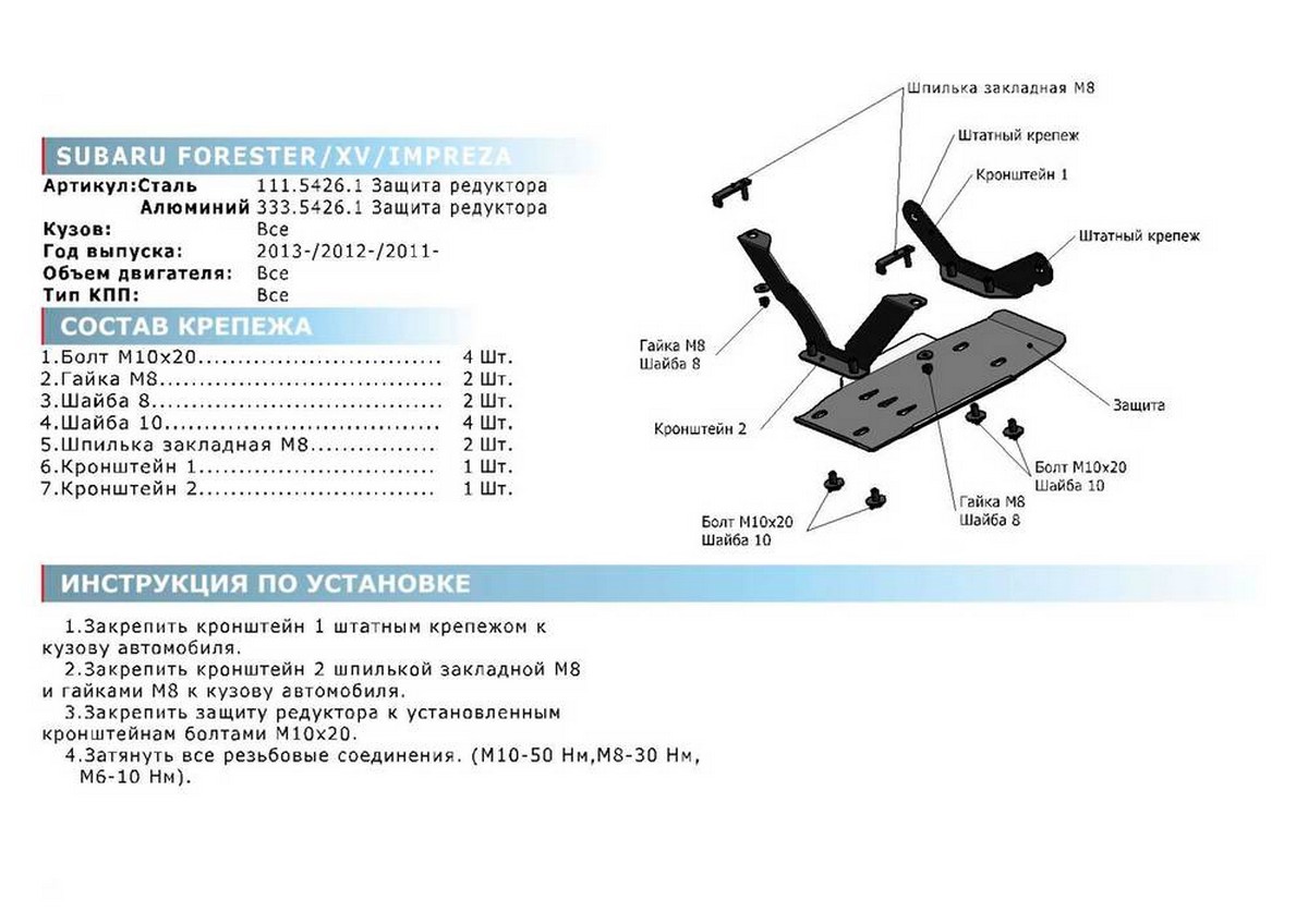 Защита редуктора Rival для Subaru Forester (V - все) 2013-2016/Subaru Forester (V - все) 2016-2018/Subaru Impreza (V - 1.6; 2.0) 2012-н.в./Subaru Outback (V - 2.5) 2015-н.в./Subaru XV (V - все) 2012-2017, алюминий 4 мм, с крепежом, 333.5426.1