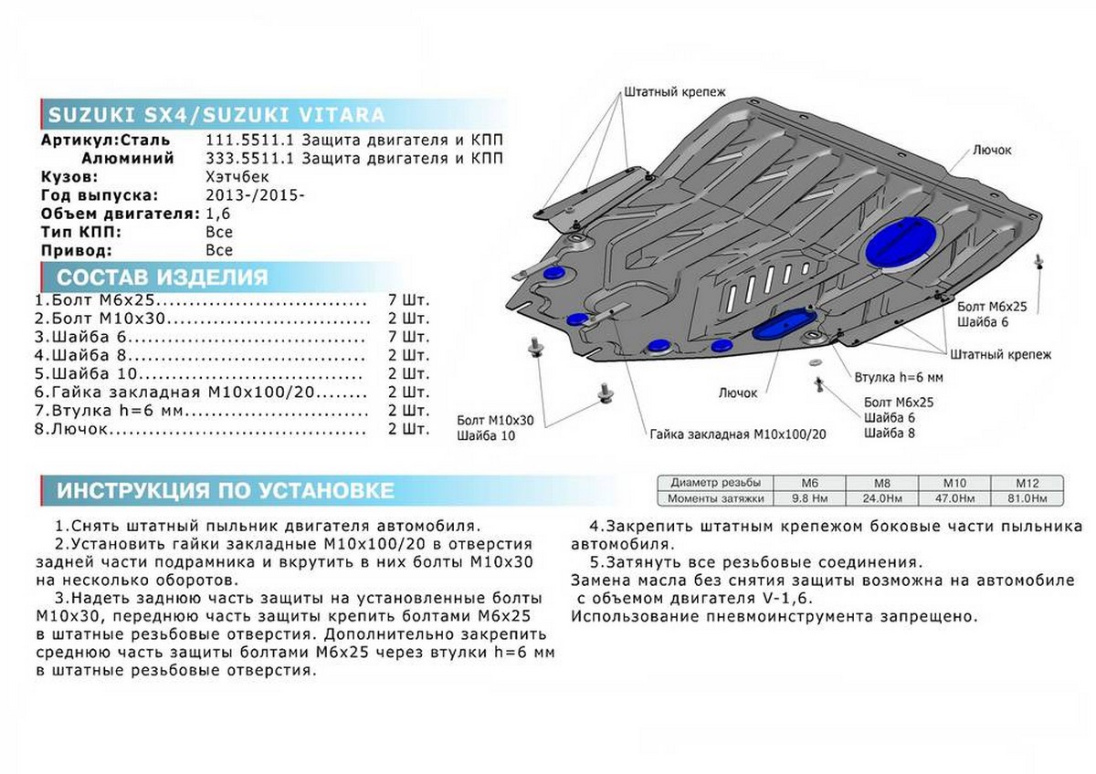 Защита картера и КПП Rival для Suzuki SX4 (V - 1.6) 2013-2016/Suzuki Vitara (V - 1.6) 2015-н.в., алюминий 4 мм, с крепежом, 333.5511.1
