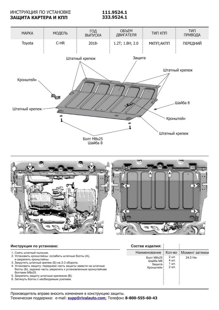 Защита картера и КПП Rival для Toyota C-HR (V - 1.2t; 1.8h; 2.0) FWD 2018-н.в., алюминий 4 мм, с крепежом, 333.9524.1