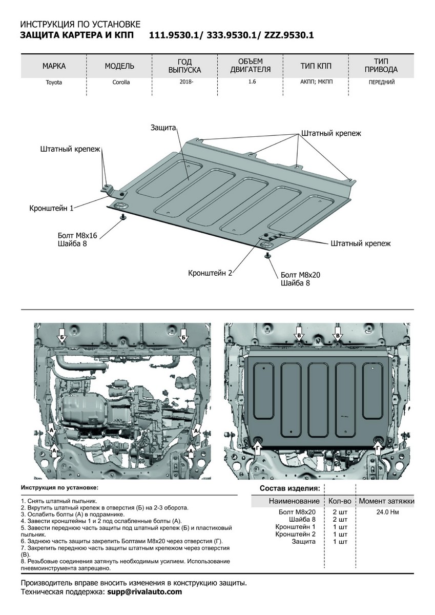 Защита картера и КПП Rival для Toyota Corolla E210 (V - 1.6) 2018-н.в., алюминий 4 мм, с крепежом, 333.9530.1