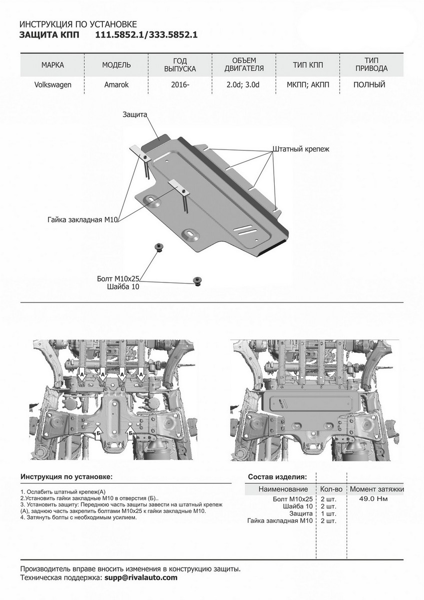 Защита КПП Rival для Volkswagen Amarok (V - 2.0d; 3.0d) 2016-н.в., алюминий 4 мм, с крепежом, 333.5852.1