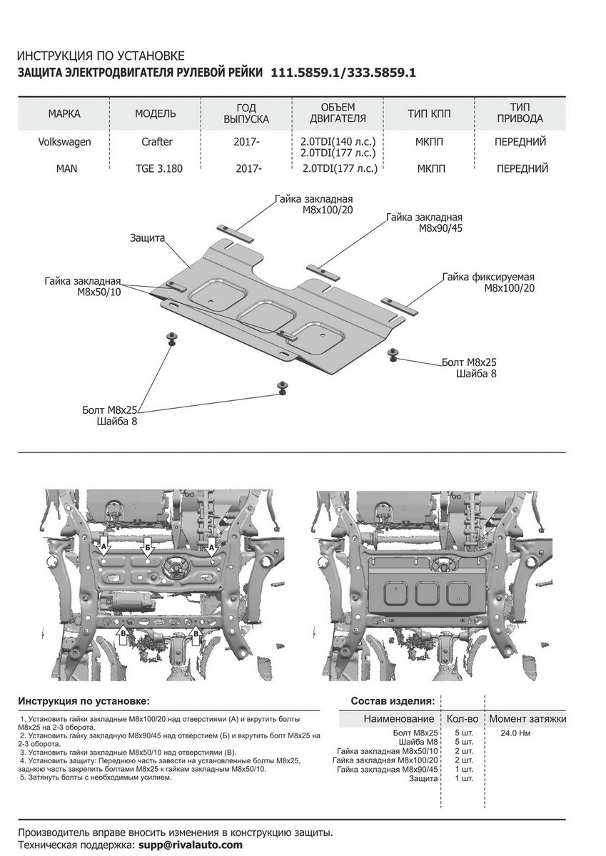 Защита электродвигателя рулевой рейки Rival для Man TGE 3.180 (V - 2.0TDI (177 л.с.)) МКПП FWD 2017-н.в./Volkswagen Crafter (V - 2.0TDI (140 л.с.); 2.0TDI (177 л.с.)) МКПП FWD 2017-н.в., алюминий 4 мм, с крепежом, 333.5859.1