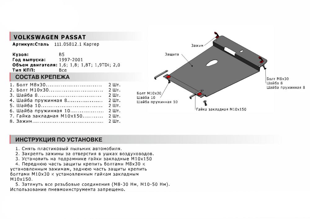 В нашем интернет-магазине можно купить Защиту картера Автоброня для Volkswagen Passat B5, V - 1,6; 1,8; 1.8T; 1.9TDi 1997-2001