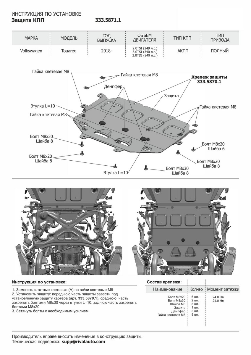Защита КПП Rival для Volkswagen Touareg III (V - 3.0TDI (249 л.с.); 2.0TSI (249 л.с.); 3.0TSI (340 л.с.)) (включая пакеты "Движение по бездорожью", "Подвеска Pro") 2018-н.в., алюминий 4 мм, с крепежом, 333.5871.1