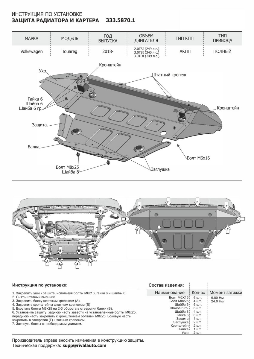 Защита радиатора и картера Rival для Volkswagen Touareg III (V - 3.0TDI (249 л.с.); 2.0TSI (249 л.с.); 3.0TSI (340 л.с.)) (включая пакеты "Движение по бездорожью", "Подвеска Pro") 2018-н.в., алюминий 4 мм, с крепежом, 333.5870.1